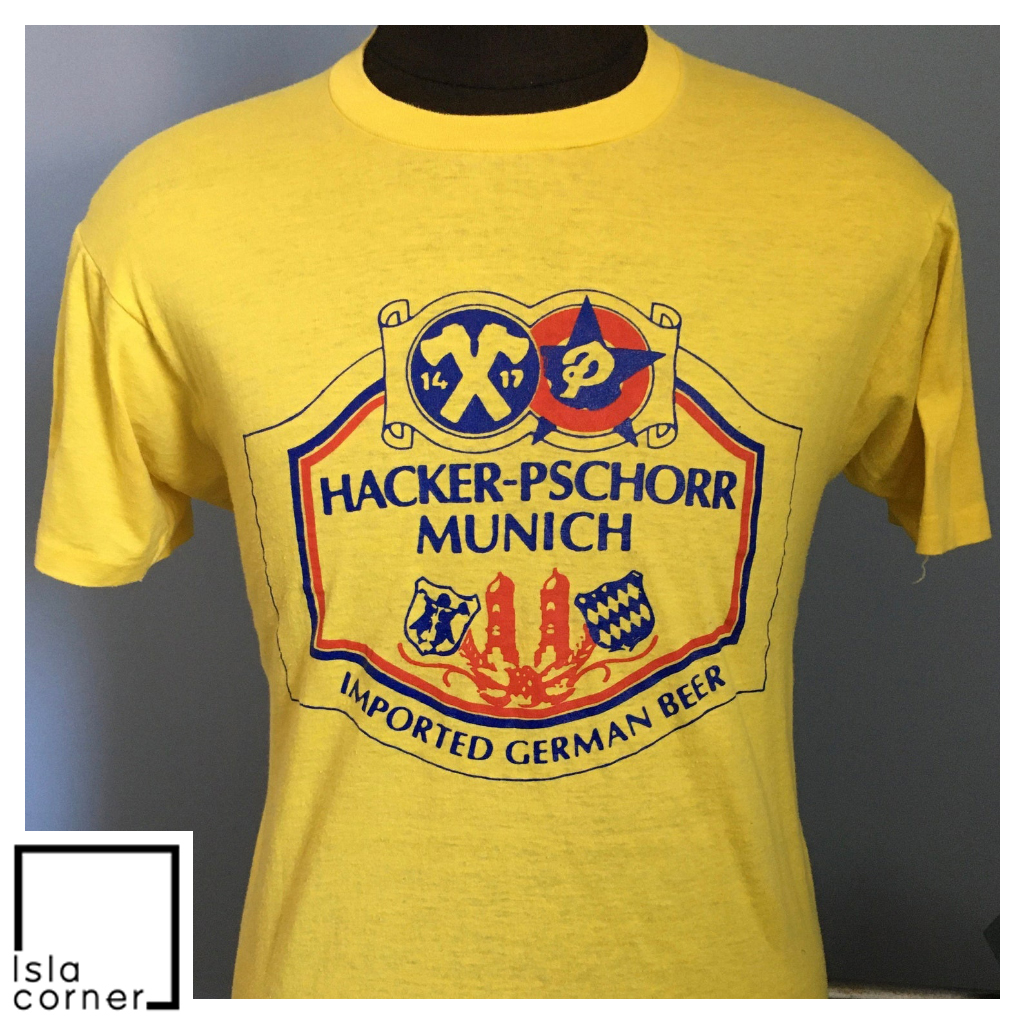 Have a look at the detailed information about 80's Vintage Hacker-Pschorr Munich Imported German Beer Shirt below!