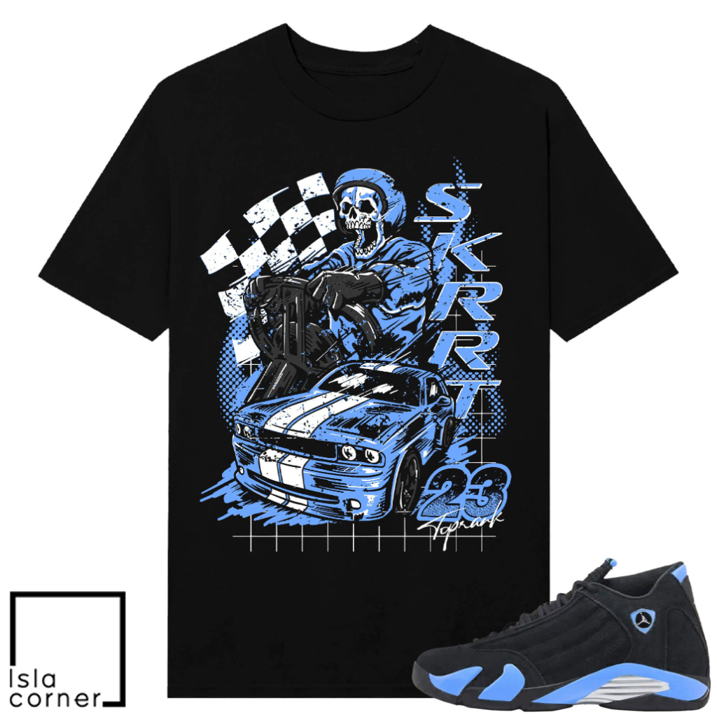 Rev up your style with this Jordan 14 Black University Blue sneaker match tee Toprank Racing. Featuring bold, motorsport-inspired graphics, it pairs perfectly with the colorway for a fast, street-ready look. Sneakers shown are for display only and are not included. A standout piece for your rotation!